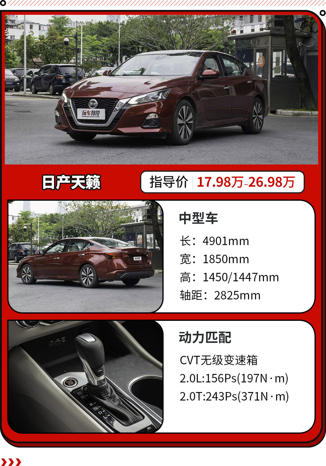 首先推荐日产天籁2.0T低配的智进版,比起自动吸气版本,不仅动力变得更强,还多了换挡拨片和主动降噪等配置,只比自吸版本顶配贵了七千元。
