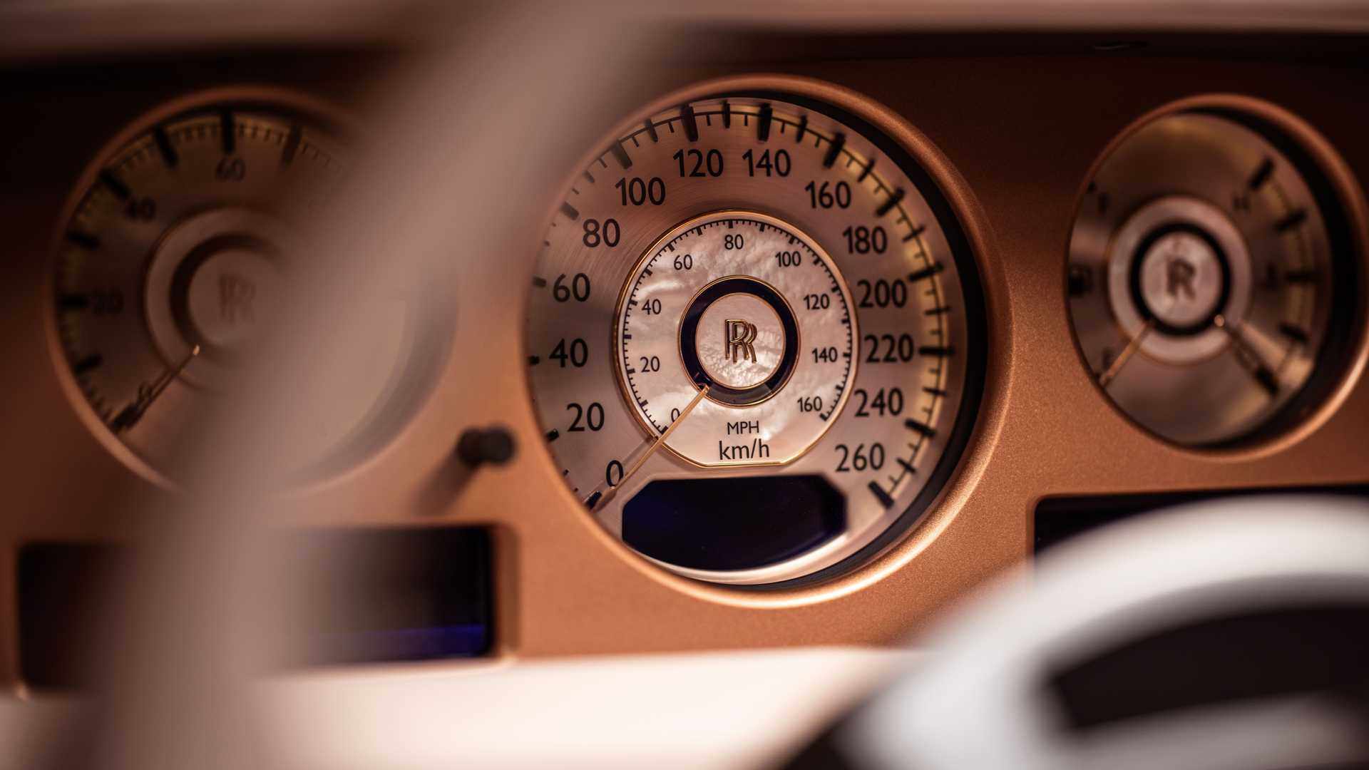 值得一提的是,车头处经典的欢庆女神雕塑采用的是玫瑰金色涂装,高级奢华感显露无疑。