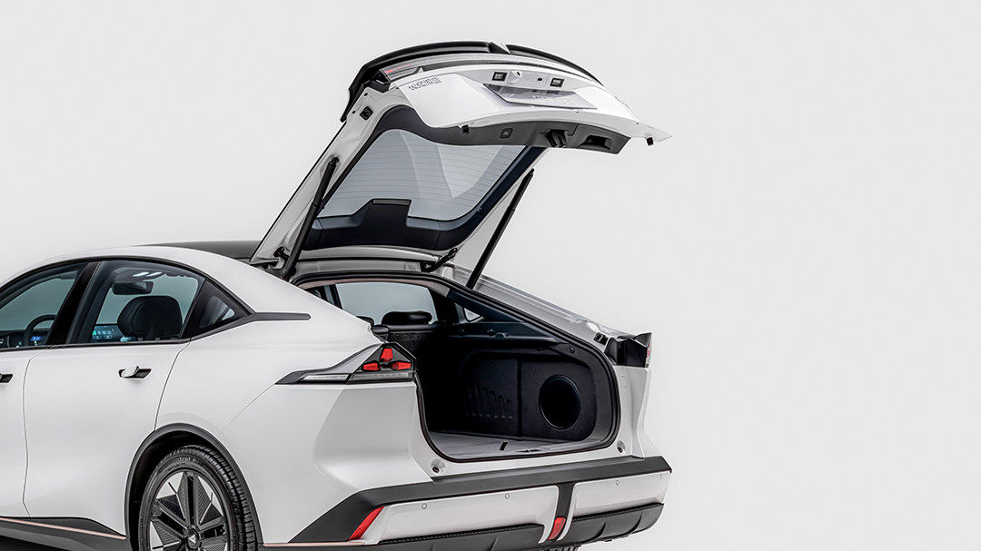 车尾部分使用起亚EV6同款贯穿式尾灯,尾门下半部分与牌照框以及下包围颜色统一,搭配雾银饰板以及下包围,契合了整车夸张设计风格。