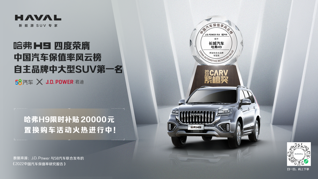 10月25日,在“58汽车×J.D.POWER丨君迪 2022年紫檀奖-中国汽车保值率风云榜”颁奖典礼中,哈弗H9三年保值率荣膺“中国品牌中大型SUV第一名”殊荣,连续四年夺魁,同时位列全品牌中大型SUV榜单第二。在此之前,哈弗H9就曾杀入全品牌中大型SUV前十,在竞争激烈的中大型SUV细分领域,带领自主品牌抗衡一众合资豪华品牌。本次获奖,可看作是是市场对哈弗H9的有力肯定,又一次树立了自主越野车型品质力的新里程碑。