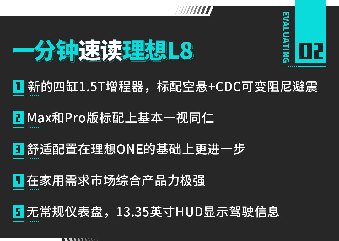 对于理想L8的产品力,新车已经上市一段时间,配置参数表也是一搜即得,教授想用一段话去总结下L8: