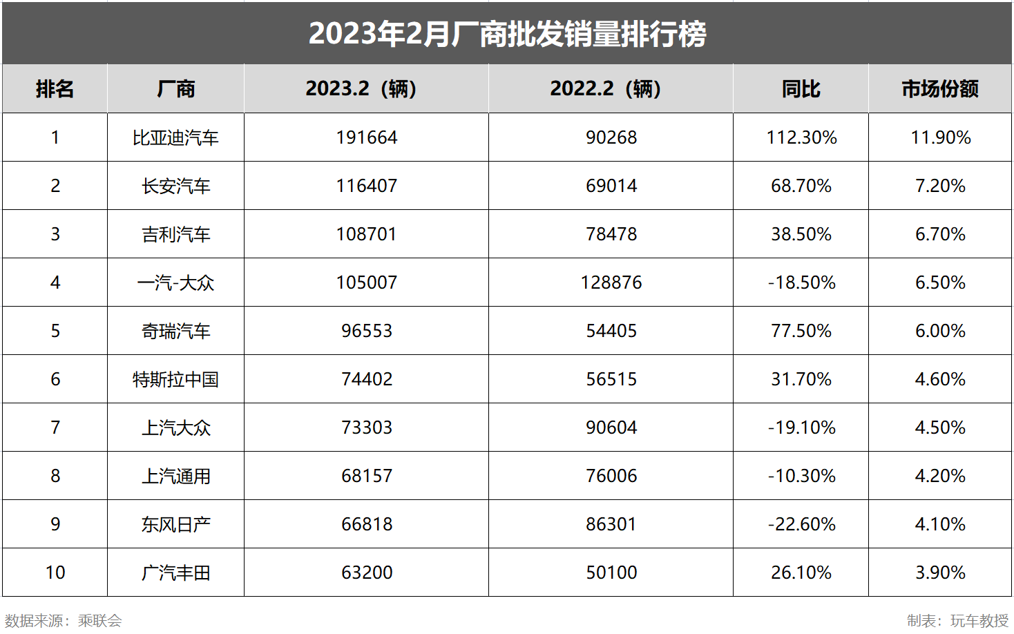 比亚迪在2023年2月份的厂商批发销量为191664辆,相较于去年同期的90268辆同比增长112.3%,并且以11.9%的市占率遥遥领先于其它车企,稳居“2023年2月厂商批发销量排行榜”榜首。