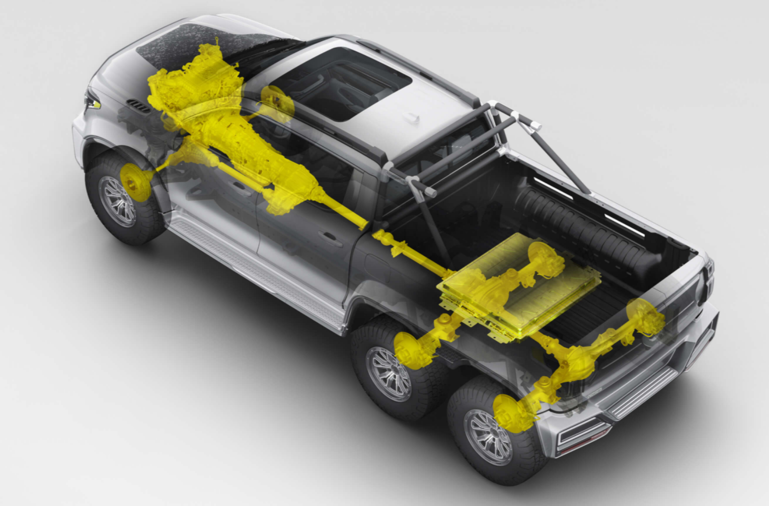 CYBERP!CKUP还标配了包括后桥差速锁、中桥差速锁、中后桥轴间差速锁、分动器中央差速锁、前桥差速锁在内的5把差速锁,并且搭载了能够承受高达1900N·m扭矩的博格华纳TOD+Mlock智能分动器。