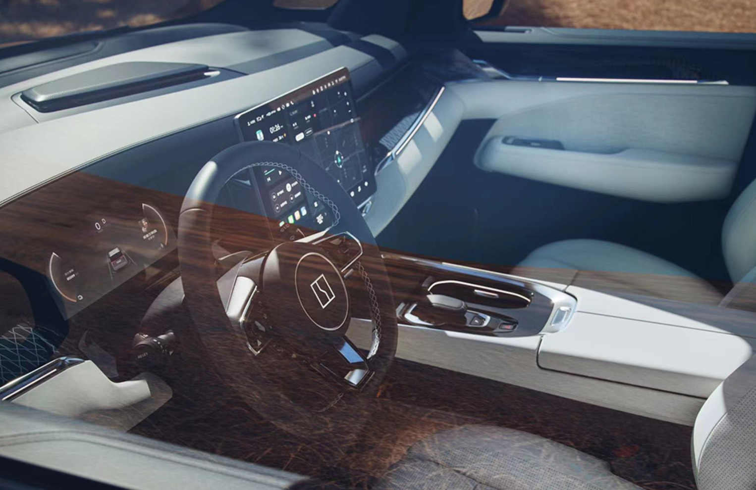 极氪009的车内和外观一样整体采用了简约科幻的设计思路。新车中控台上标配了一块10.25英寸的全液晶仪表盘和一块15.4英寸悬浮式中控大屏,二排车型还配备了一块15.6英寸的吸顶屏。