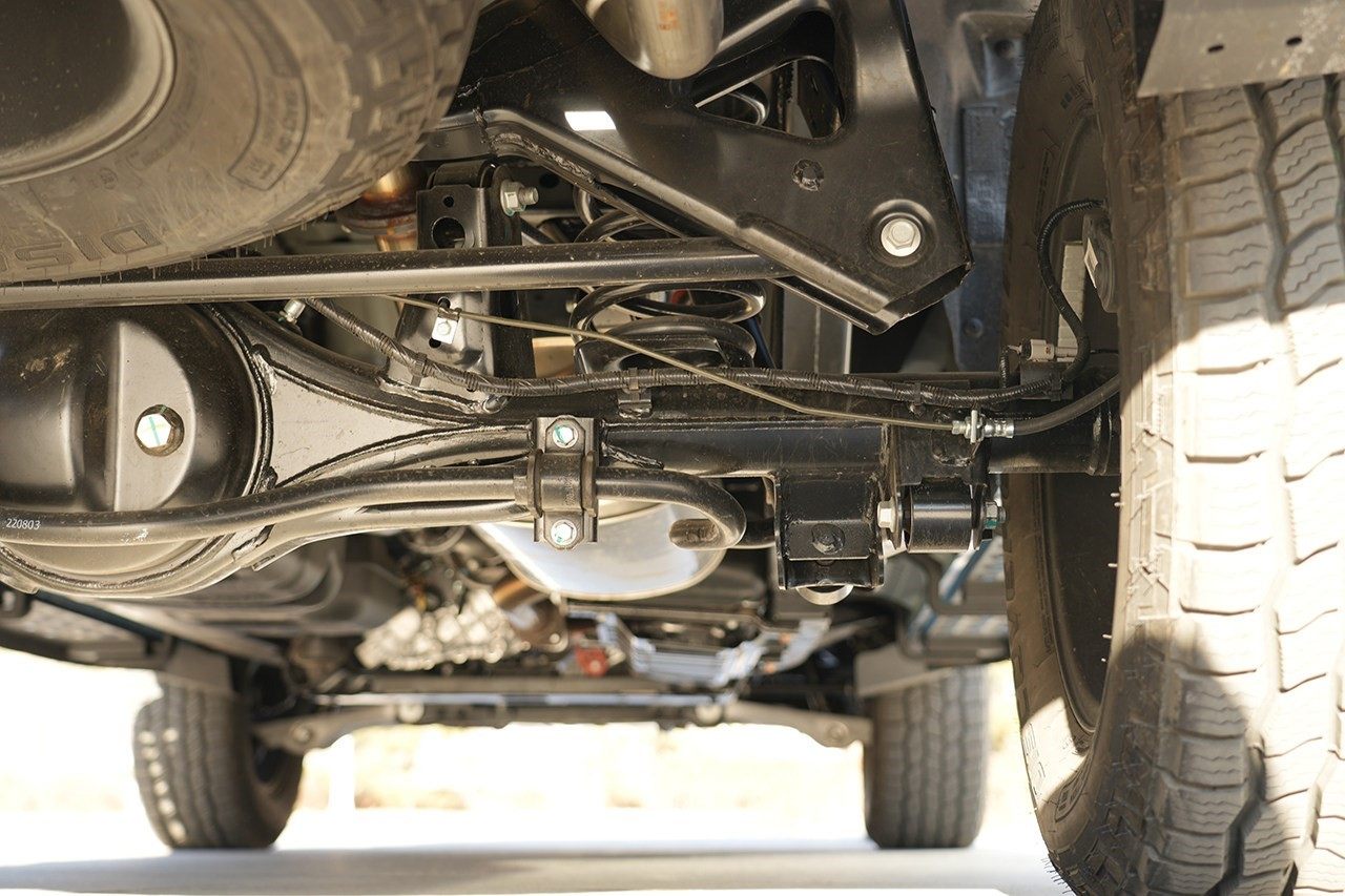 之所以很多皮卡可以拿来越野,是因为它们采用了非承载式车身结构,中兴1949的底盘更是进行了加宽优化,融合了美式皮卡底盘设计思路。而且全系采用了美铝合金双叉臂前悬架,这次试驾的乘用版本车型后桥采用了五连杆整体桥,并且还配备了来自博格华纳的分时四驱系统,后桥配备了伊顿式差速锁,硬派越野元素全部囊括了。