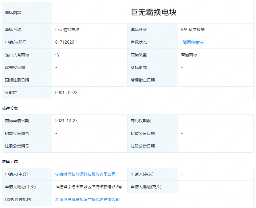 有意思的是,宁王显然不允许自己的换电大计存在短板,而巧克力换电块也并不是宁德时代在换电技术领域的全部布局。早在2021年12月,宁德时代申请“巧克力换电块”商标的同时就已经申请了“巨无霸换电块”。