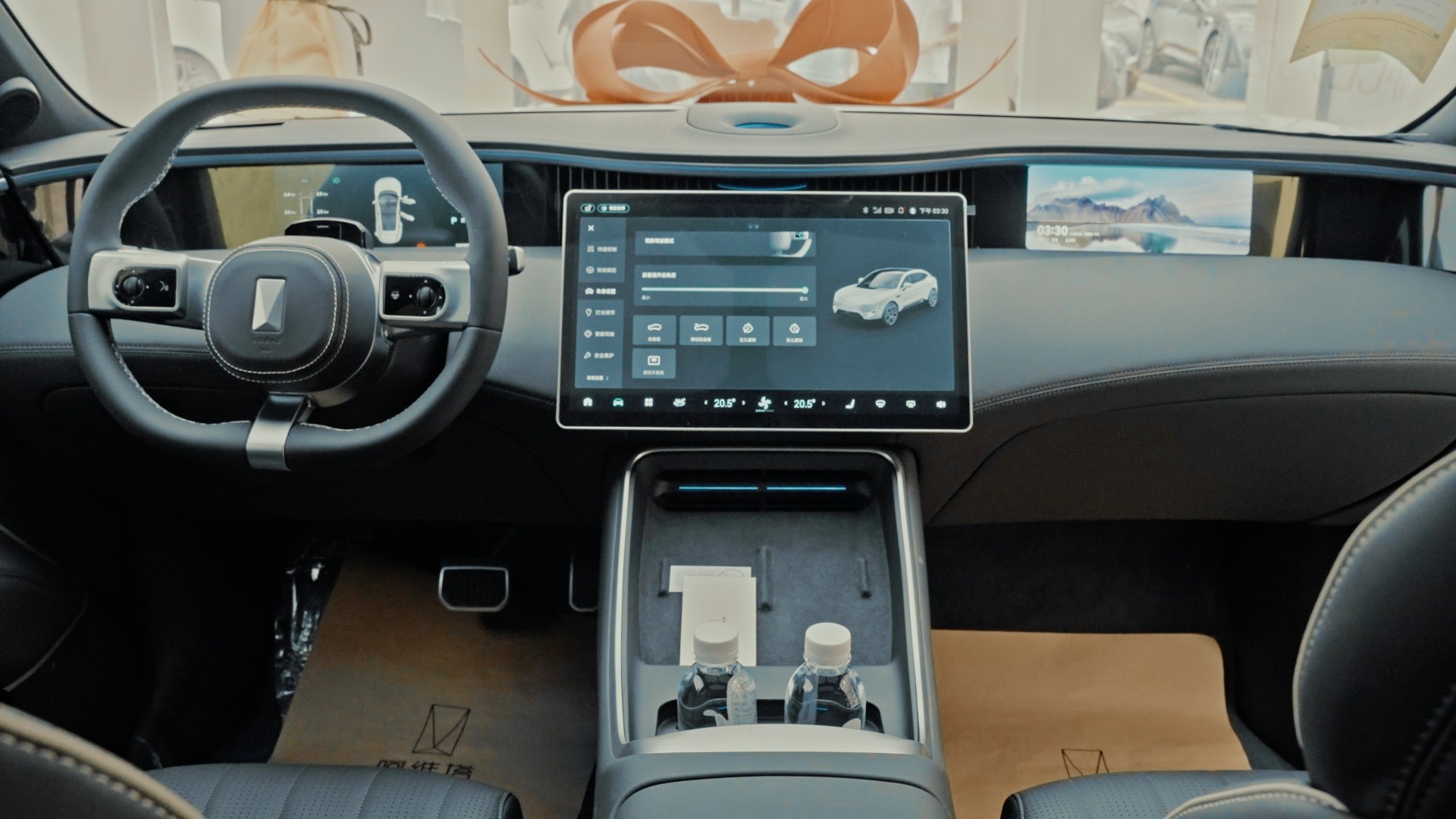 新车的车内可以说满是屏幕,中控由主副驾两块10.25英寸高清液晶屏和15.6英寸高清悬浮式中央触控屏构成,但亮眼的是中间的感情旋涡。