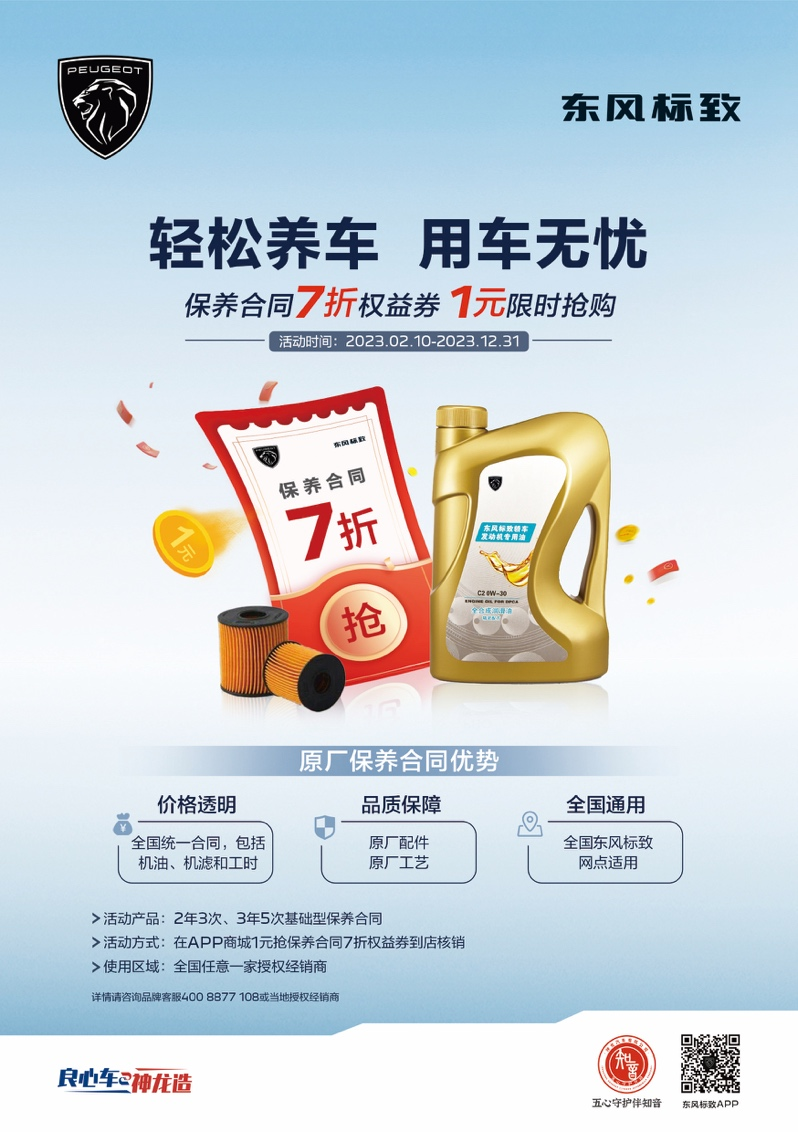 此外,东风标致在2023年2月10日至2023年12月31日期间,还推出了保养合同7折权益券1元限时抢购。东风标致原厂保养合同具有“价格透明”“品质保障”和“全国通用”三大优势,让客户轻松养车,用车无忧。很多人喜欢在自驾出游前和回来后,对车辆进行检查和保养车辆,以保证安全,现在趁着东风标致保养合同7折权益券可以1元限时抢购,快点给自己的爱车来一次保养吧。