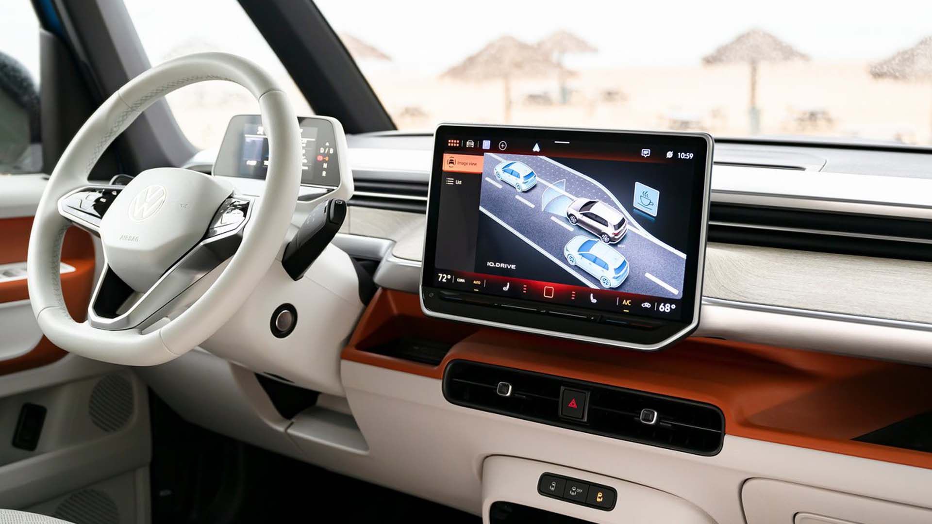 进入车内,ID.Buzz给人的感觉就是很时尚很温馨。暖色系的配色有种居家的舒服感,而且整体上延续了短轴版的内饰设计。采用5.3英寸的液晶仪表盘和12.9英寸的中控屏,车机系统此次将参照ID.7车机系统升级,并集中多种功能在中控屏上。尽管屏幕等硬件上可能比不上ID.7,但是在智能方面和车机系统方面还是有着质的提升。智能智驾方面,标配L2级IQ.DRIVE辅助驾驶系统,支持主流智能辅助功能,例如车道居中保持、动态路标显示、泊车辅助系统等实用性功能。