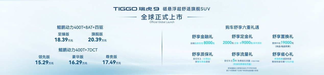 6月16日,奇瑞汽车重磅打造的磁悬浮超舒适旗舰SUV-瑞虎9在深圳惊艳亮相,共推出领先版、豪华版、尊贵版、至臻版、旗舰版5款车型,官方指导价15.29-20.39万元。针对购车用户特推出6重惊喜。为用户带来买无忧、用无忧、养无忧的全新价值体验。
