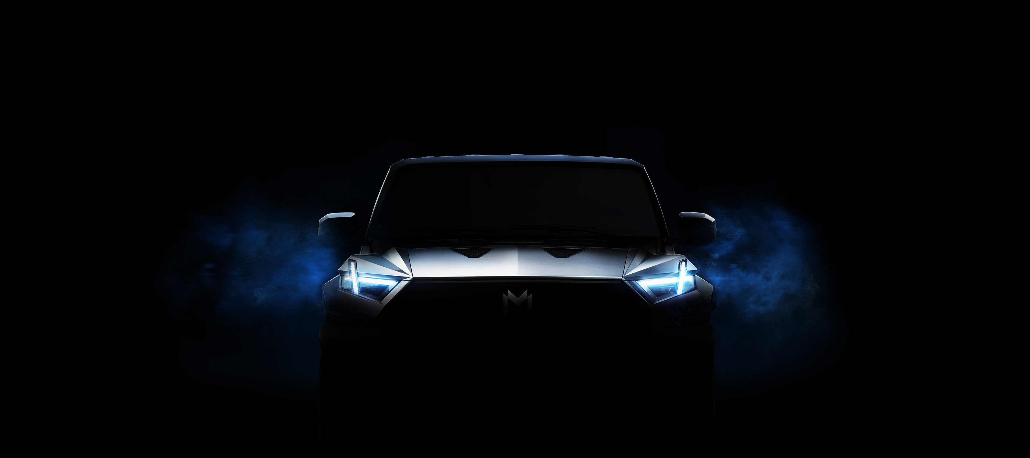 在这张我们特地仰拍的正前方照片中,展示了猛士917大量的,专为越野工况设计的细节。首先,猛士917整个下保险杠用的是特别强化过的,铁灰色的钢制保险杠,这种铁灰色设计不仅能强调车子的硬派基调,在遇到诸如冲撞岩石等越野路况时,铁灰色的保险杠也能最大化减少外部环境对整车外观的影响,说句大白话就是,更耐刮了。
