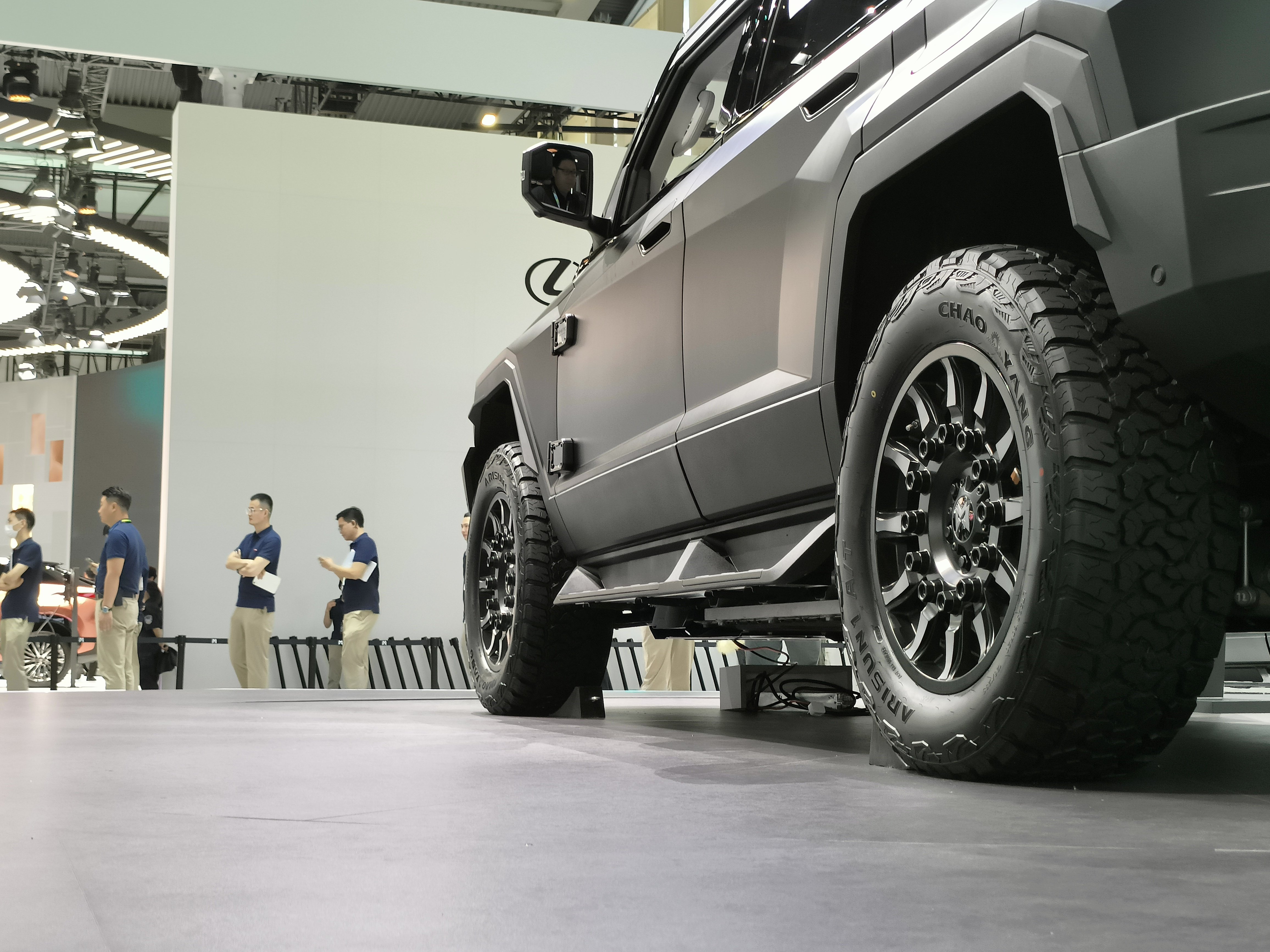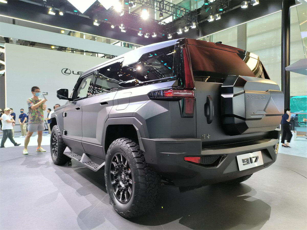 正如图中所示,这车的外观设计非常夸张,大量的棱角和折线、高得惊人的接近角和离去角,还有一看就很高的离地间隙,这一系列设计风格都不由得让人想起了军版三代猛士。但相比起军车那特殊的底盘结构,猛士917的底盘,在某种程度上,也可以代表目前我国新能源越野车的最高水准之一。