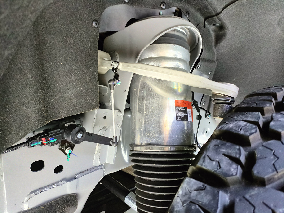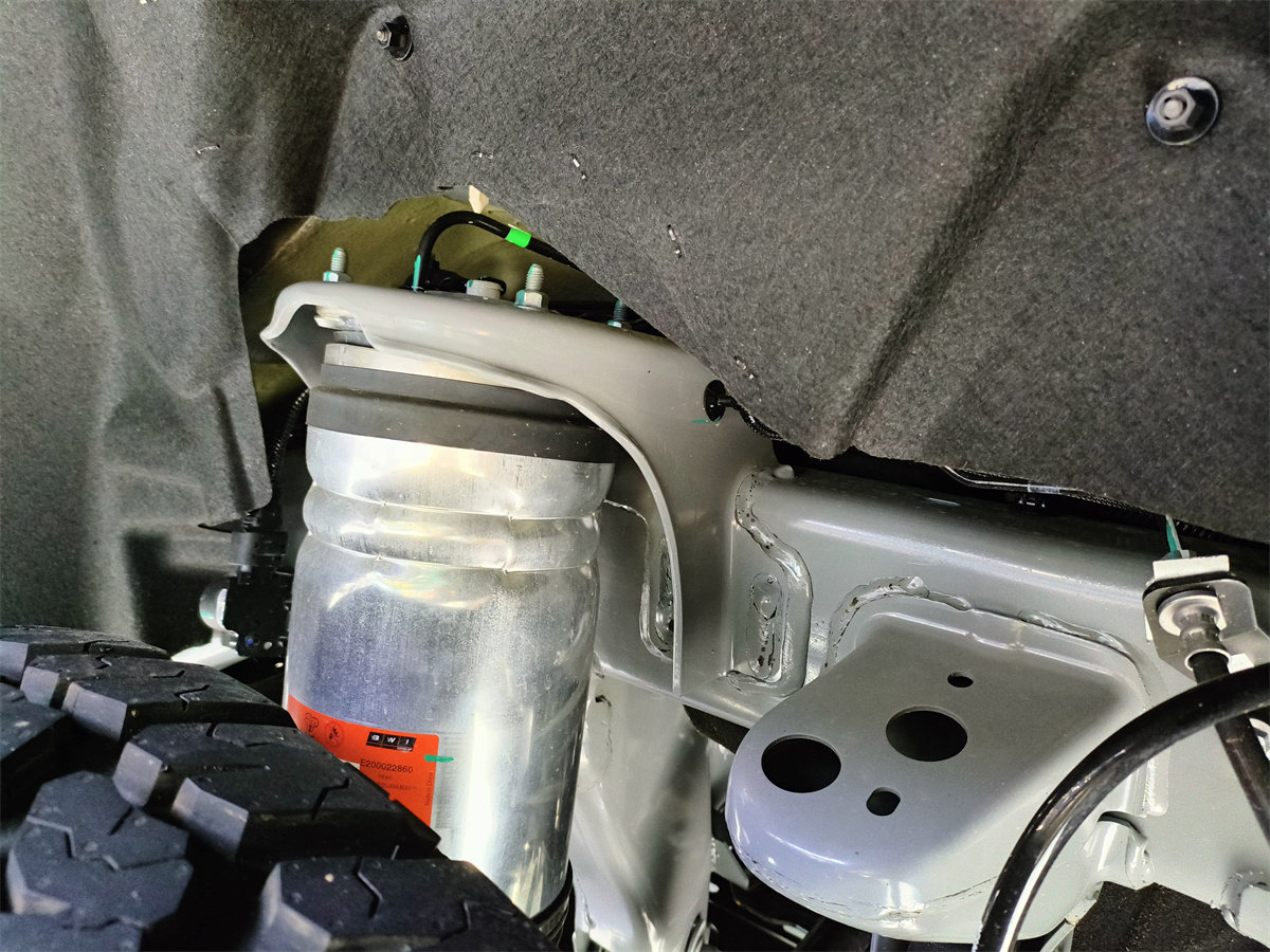 而这张图展示了猛士917的悬挂细节,这里可以很明显地看出,中间极其粗大的圆筒状物体,是它的空悬减震器。这个空悬跟我们见过的其他空悬都不一样,可以明显看出,空悬整个腔体的用料的非常厚实,在空悬上下连接位置也做了特殊的加固,很明显,这是一套专门应付极端恶劣越野工况的,能确保在高强度越野下也不会出问题的,经特别强化的空悬套件。
