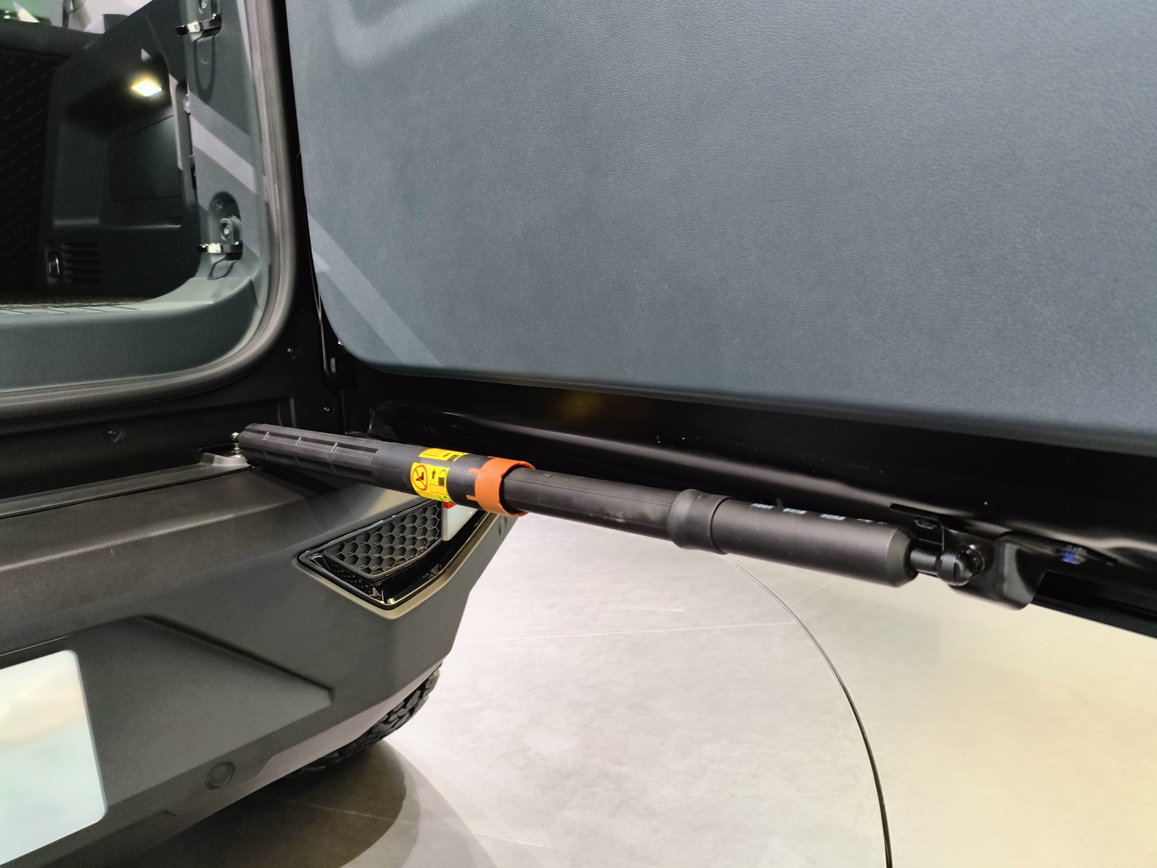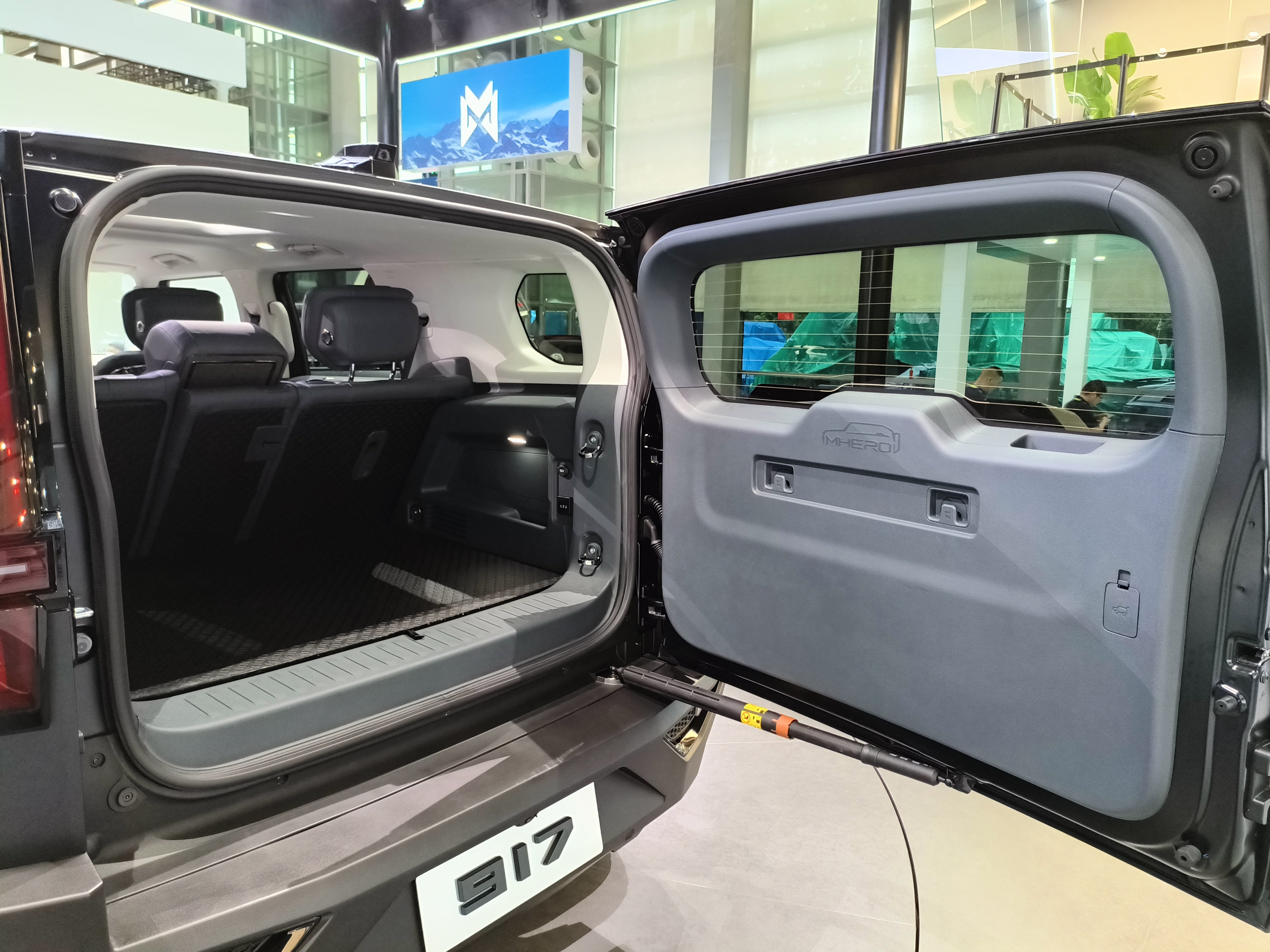 尾门有个粗壮的把手用于开门,在开门后,尾门下方有一条厚实的液压杆实现对尾门的支撑和无级停止。后备箱空间看着不多,但其实空间很大,跟MPV是没法比的,但和这个级别的大多数5座SUV基本处于同一水平。而且猛士917的后备箱底部不像传统SUV那样,采用类似于绒布的包裹材料,而是用了一种独特的,摸起来有点像“凝固的水泥”一样的耐磨材料。很明显,这个后备箱材料是给用户放一些硬物用的。