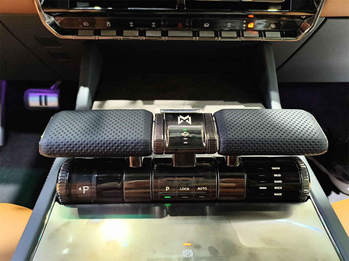 例如挡把区域的这个巨大无比的,有点类似于飞机节流阀控制器的机构,你可能会好奇这是干啥用的。靠近驾驶员一侧的是挡杆,前后推拉可以控制挡位。挡杆下面的圆环是P挡按钮。而靠副驾一侧的是驾驶模式推杆,能在雪地、泥地、沙地、攀岩和涉水5种模式选择。而两个推杆中间的三个按钮,从左到右分别是自动驻车、中差锁和自动工况模式(就是根据实时路面状况自动切换相对应的工况模式)。而在这个巨大的机构后面是触摸形式的手刹。