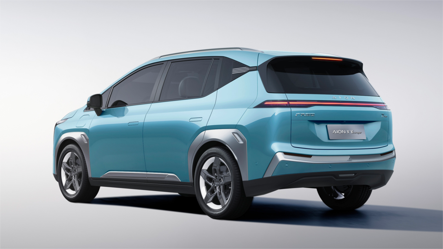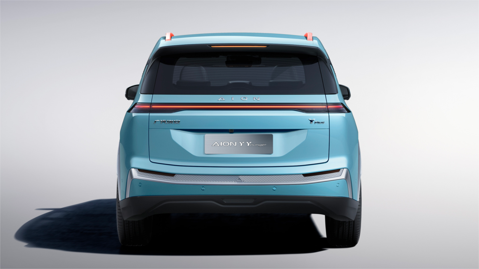 车尾部分,与目前主流的溜背式设计不同,AION Y Younger星耀版很多设计都是为了车内空间服务,因此它的车位设计更加偏向于平直。新车硬朗的车顶配备了一个扰流板,搭配“天际线”贯穿式尾灯以及银色弧形饰板,有着相当强烈的辨识度。