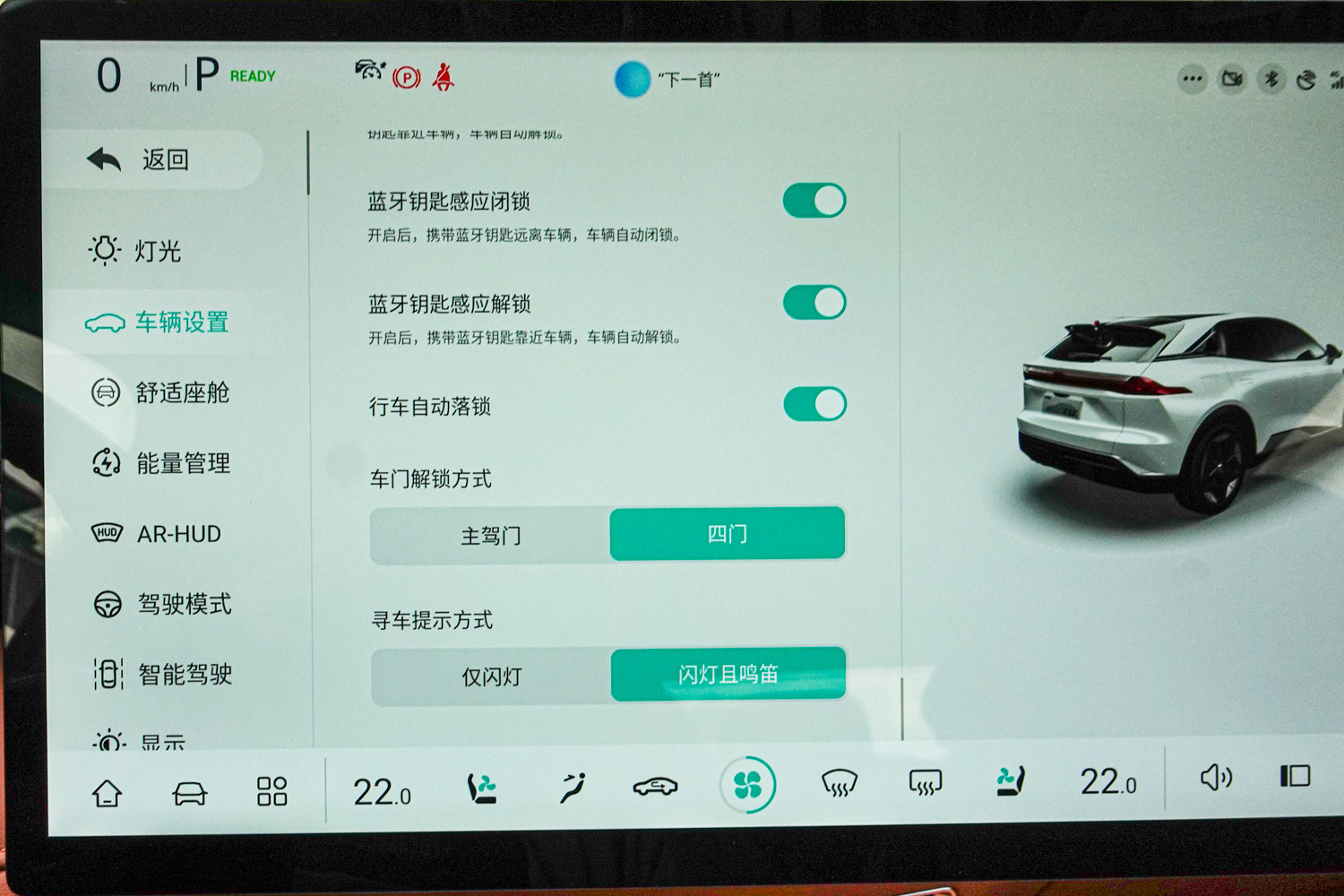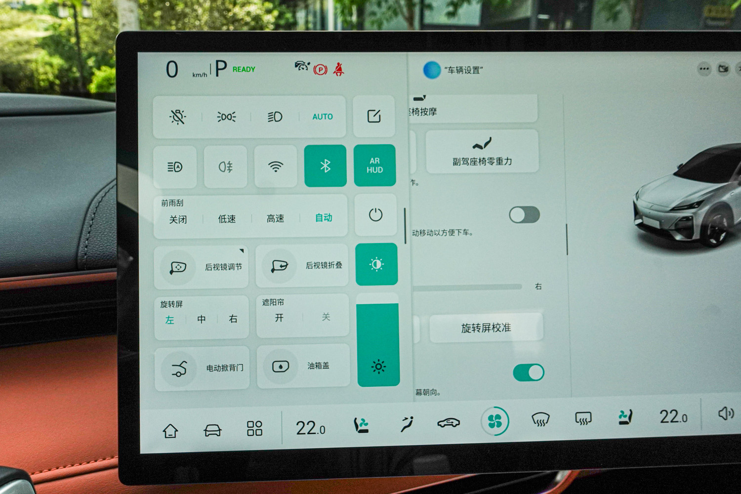 在屏幕左侧可以呼出车机快捷控制菜单,比如灯光、蓝牙、屏幕亮度、AR-HUD全息式增强现实系统、前雨刮、后视镜、旋转屏、遮阳帘、电动尾门等常用功能,操作便捷,逻辑如同智能手机,上手难度低。