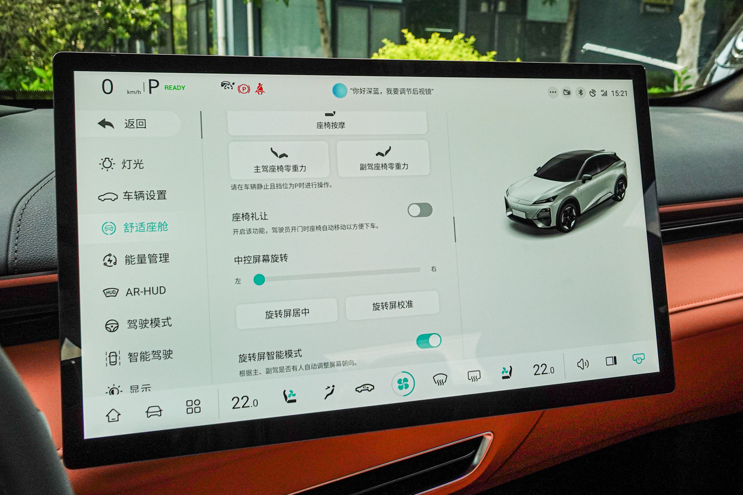 比亚迪中控屏可以旋转,极氪中控屏可实现横向平移,现在中控屏都被玩出了花,深蓝S7自不能落于人后。15.6英寸向日葵屏可实现左右最大15°的旋转功能,方便驾驶者或副驾驶乘客进行中控屏操作。