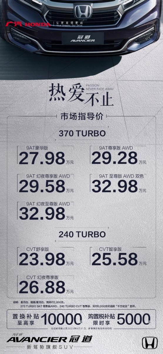 8月8日,广汽本田“新驾势旗舰SUV”新款冠道燃擎出击,新车共推出8个版本,官方指导价为23.98-32.98万元。购置政策方面,广汽本田释放了满满的购车权益,消费者至高享10,000元置换补贴,限时享5,000元购置税补贴(政策时间截止至2023年8月31日)。