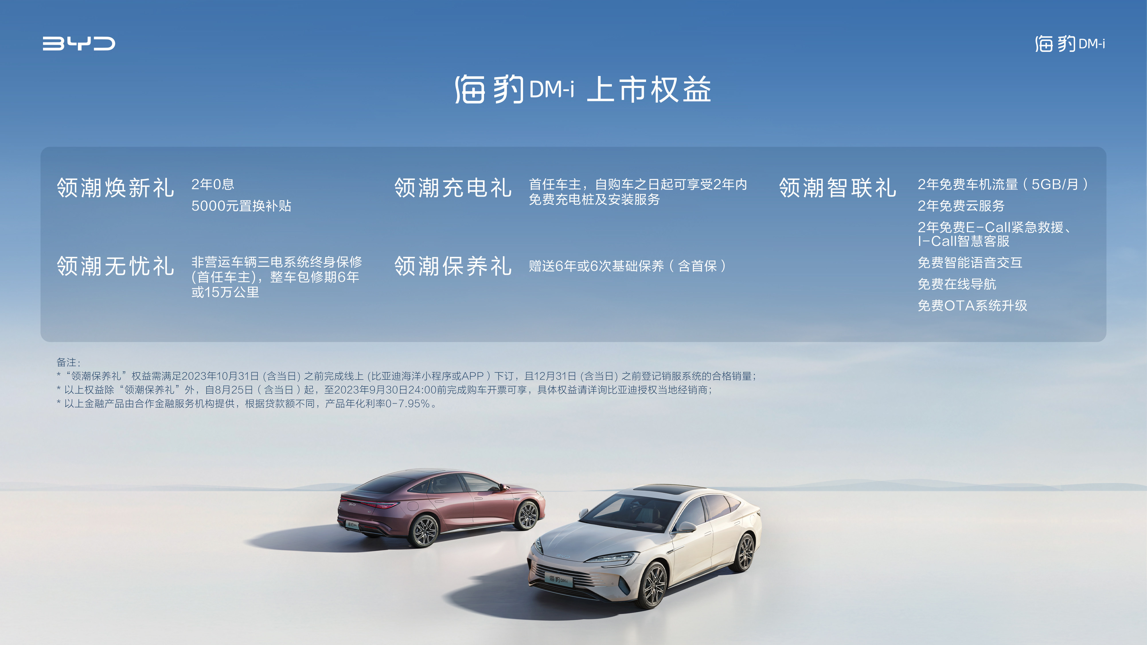 上市销售政策方面,比亚迪为购买海豹DM-i的用户准备了2年0息、5000元置换补贴;赠送6年或6次基础保养;首任车主非营运车辆三电终身保修等多重上市礼遇。