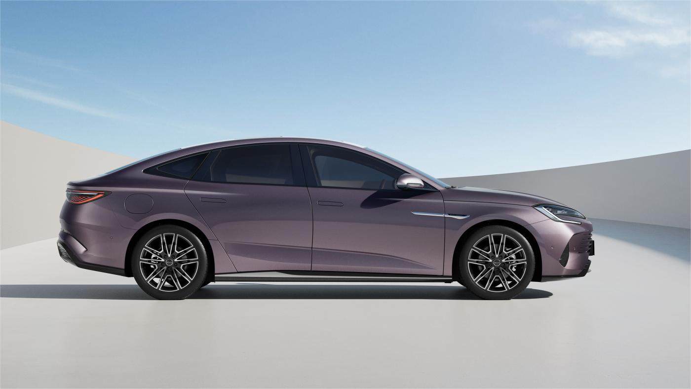 海豹DM-i低趴的车头和溜背以及尾箱部分的扰流造型设计让侧面整体非常动感。另外,从前大灯延伸到前门,又从后门延伸到尾灯的前后两条腰线彼此独立,起到了比例分割的作用,让整车视觉效果显得更加简洁修长。