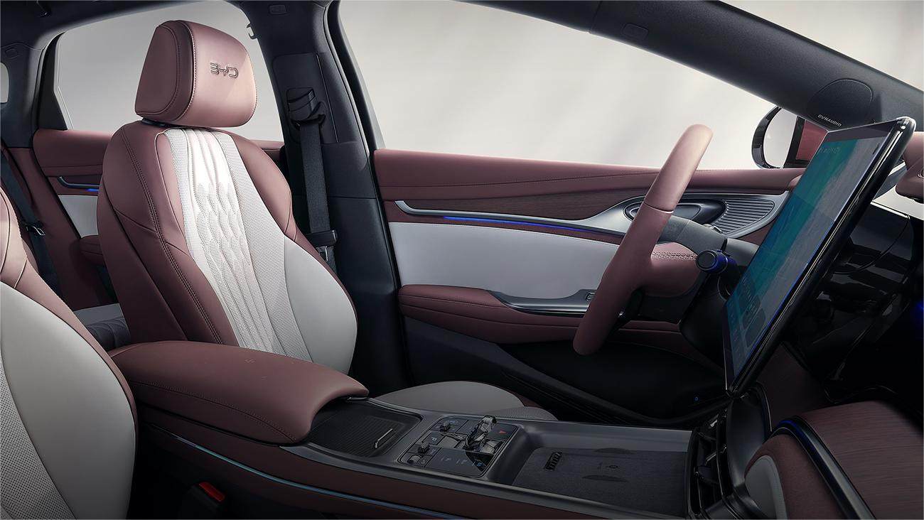 另外,海豹DM-i的座椅缝线灵感来自船划过水面时层层漾开的涟漪,配合红米双拼色设计,营造出柔和舒适之感。座椅造型宽大、填充软硬适中,且针对两翼及肩部进行了材料优化,兼具出色的包裹感和支撑性。