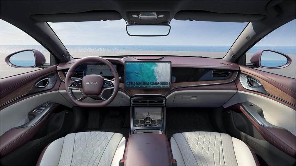 相比起多元化的外观造型,海豹DM-i的车内的海晖新奢座舱设计则有着极为鲜明的比亚迪海洋系列车型家族式特征。