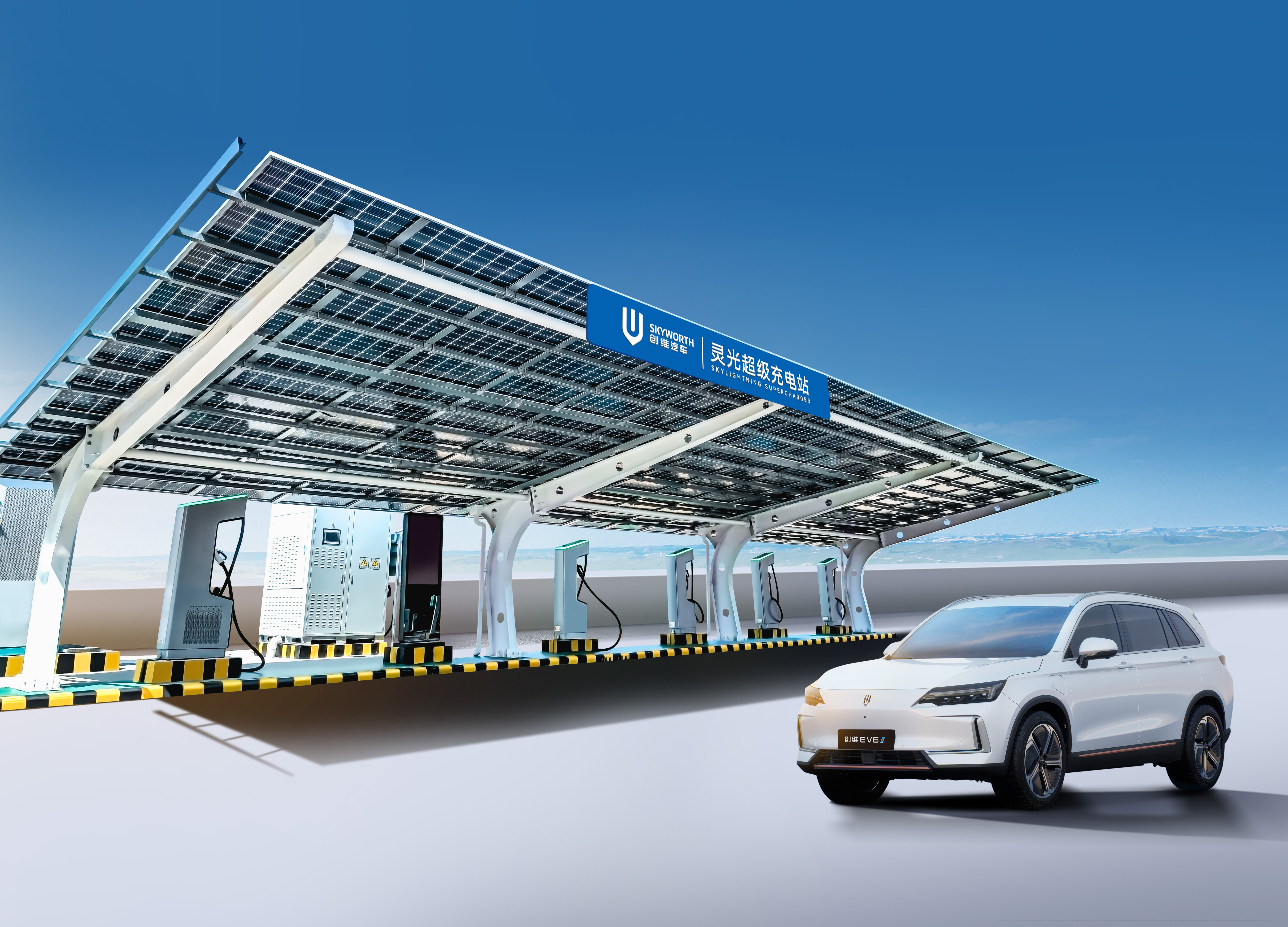 着眼于此,创维汽车以创新思维推进技术革新,与创维光伏、创维储能组成“创维新能源三角”,在新能源汽车赛道率先布局光伏+储能板块,基于“光储充运一体化”能力打造灵光超级充电站,匹配大面积10分钟以内的快速补能需求,护航新能源汽车补能的应用与发展。此外,创维汽车还在行业内首创超百千瓦移动充电站,其超充车型支持100KW直流放电,6分钟即可补能10度电,相比于3.5小时才能补能10度电的3.3KW交流放电行业主流方案,更适合集中应用于紧急救援和户外能源供应等场景。