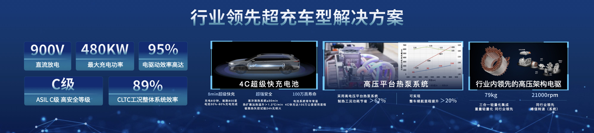 具体来看,最高工作电压900V,最大充电功率480KW,电驱动效率高达95%,ASIL C级 高安全等级,CLTC工况整体系统效率为89%,热泵系统制热工况功耗节省超67%,整车续航里程提升20%以上,79kg三合一轻量化集成,21000rpm峰值转速,各项数据指标均处于行业领先地位。