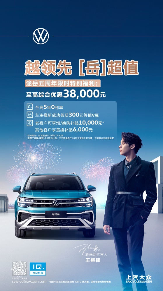 (11月3日,上海)上汽大众高颜值品质SUV顶流途岳上市五周年之际,推出至高综合优惠3.8万元的购车礼遇,共计五亿钜惠回馈用户,超高性价比带来全方位的“YUE”级之选。