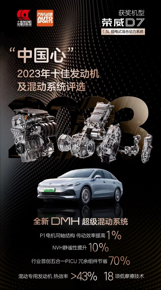 除了市场端反应热烈,行业端荣威D7凭借核心技术拿下数项行业权威大奖,以冠军实力重塑B级车市场竞争格局。作为首款落地应用DMH超级混动系统的旗舰车型,荣威D7 DMH集成了上汽在插电混动技术领域十余年技术优势,在2023混合动力汽车极限挑战赛上,拿下中大型插电式混合动力轿车组、亏电油耗全车型双料冠军之后,再次于近日举办的“中国心”2023年度十佳发动机及混动系统评选活动中,荣获“中国心”2023年度十佳发动机及混动系统称号。