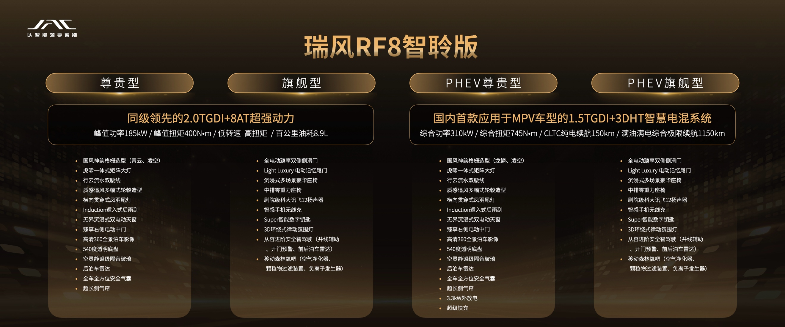 本次广州车展,江淮瑞风现场首发瑞风RF8智聆版,涵盖燃油与PHEV插混四款车型。PHEV旗舰型,预售价格为23.99万;PHEV尊贵型,预售价格21.99万;燃油旗舰型,预售价格18.99万;燃油尊贵型,预售价格16.99万。