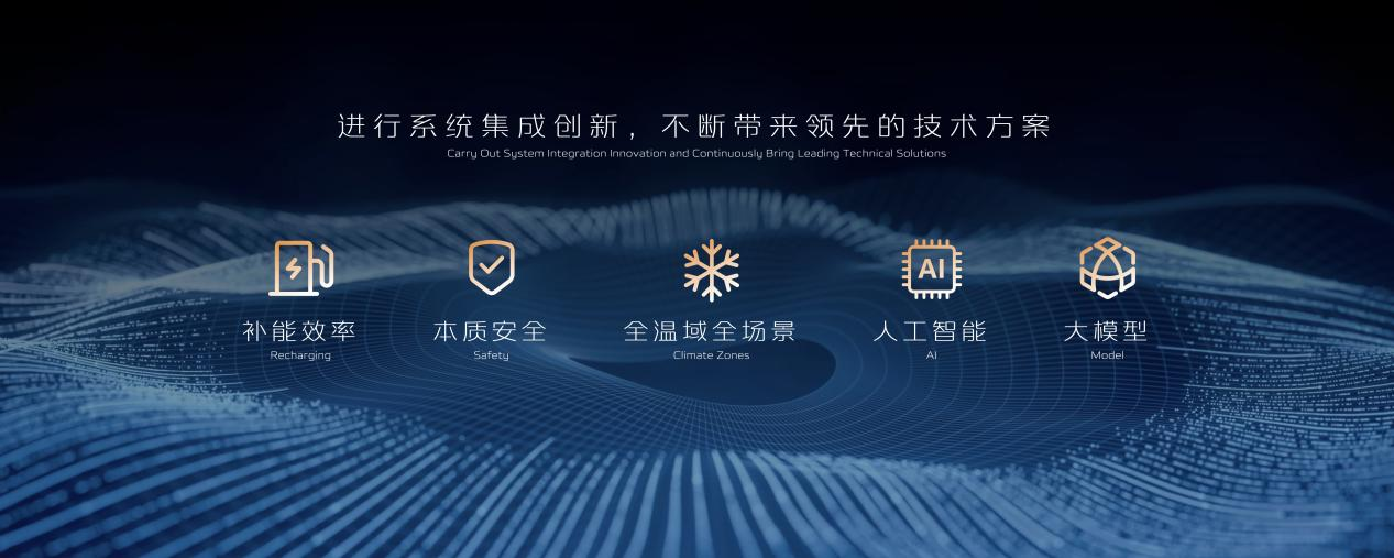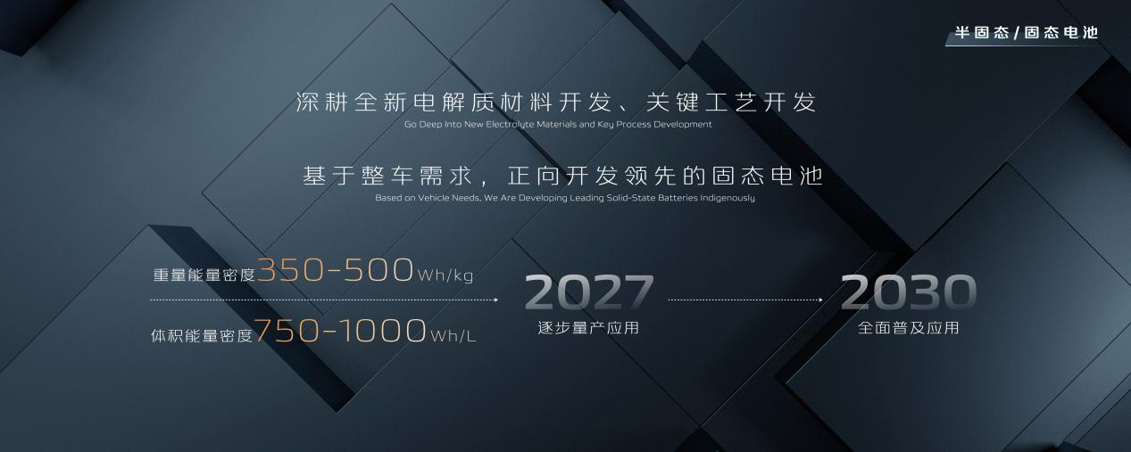 深耕半固态、固态电池,实现高效能,超长续航。推进全新电解质材料开发、关键工艺开发,将不晚于2027年推动重量能量密度达到350-500Wh/kg、体积能量密度750-1000Wh/L,并逐步量产应用,2030年实现全面普及,彻底解决用户里程焦虑。