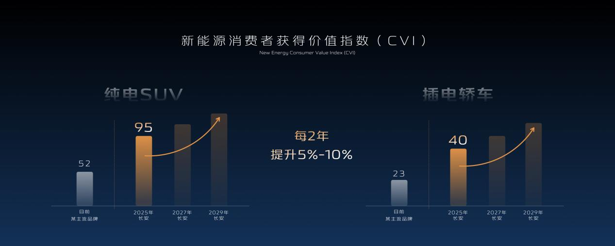 此外,长安汽车还将围绕用户思维,不断升级优化“新能源消费者获得价值指数(CVI)”(以“性价重体比”为参量开发的模型指数)。当下,某主流纯电SUV产品的CVI约为52,某主流插电轿车的CVI值约为23。长安汽车将通过不断的技术迭代,以及整车和电池系统的创新,到2025年,长安新能源汽车的同类型产品的CVI值将分别达到95和40,后续每2年提升5%-10%。