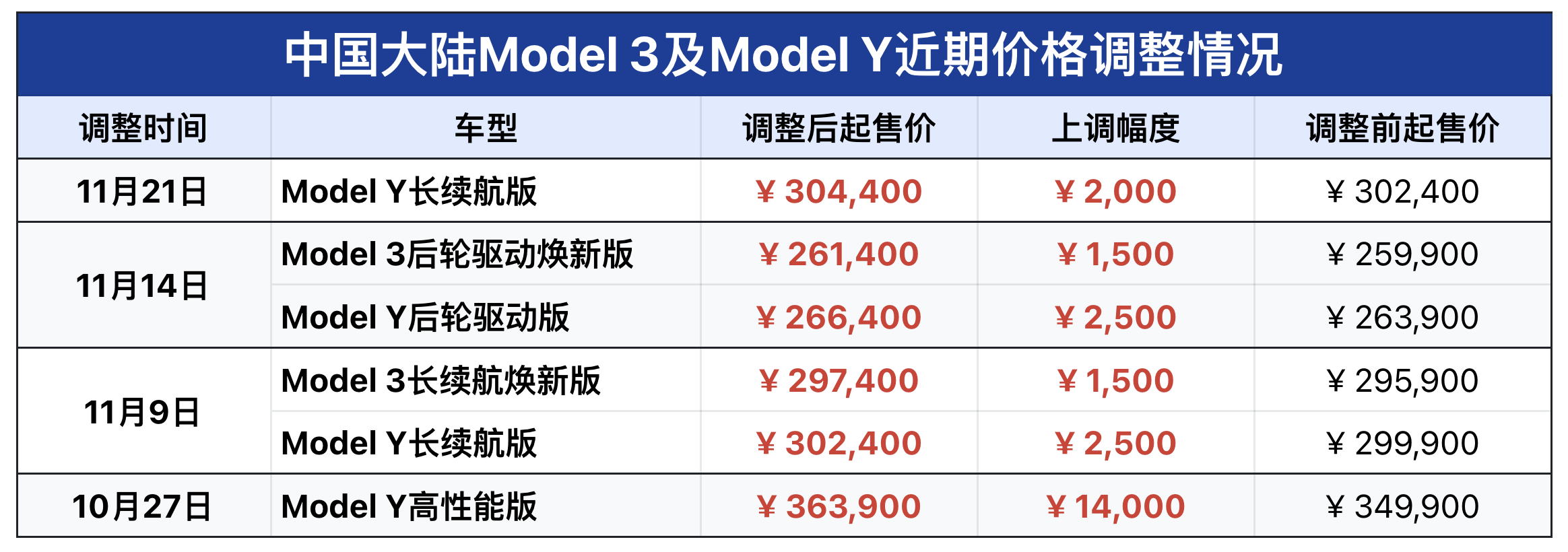 近日,特斯拉中国官网还上调了Model Y长续航全轮驱动版售价,涨幅2000元,调整后304400元起售。从10月底开始,Model 3/Y全系车型已分别经历了3次价格调整,上涨1500元至14000元不等。不少业内人士就指出,年底前最后一个月,是入手特斯拉的黄金窗口,用户还能享受限时引荐等福利。2024年起,用户不仅将错失这波价值近万元的综合权益,购置税补贴退坡后,购入部分特斯拉车型还需缴纳约2000元至44000元不等的税额。