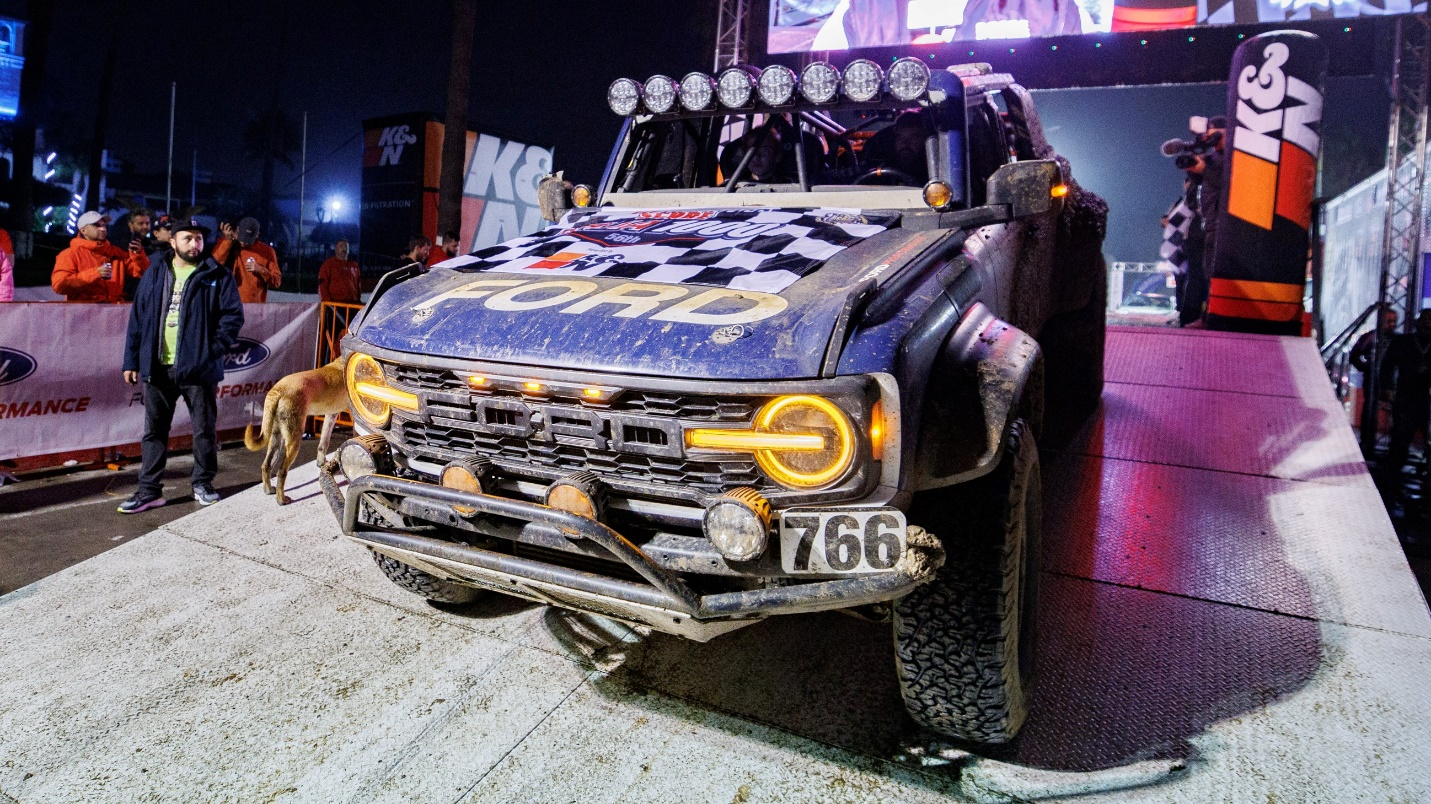 经过加利福尼亚湾的水路时,Bronco Raptor 418hp 3.0升EcoBoost发动机大显身手,在开阔水域中一路驰骋。Raptor R的5.2升V8机械增压发动机则以超过700hp的功率展示出所向披靡的澎湃动力。在即将到达恩塞纳达的最后一个弯道上,两辆福特高性能赛车齐头并进,以胜利者的昂扬姿态停在了观众席前——Bronco Raptor以40:37:47.820(非官方用时)完赛,F-150 Raptor R则是41:44:45.634。