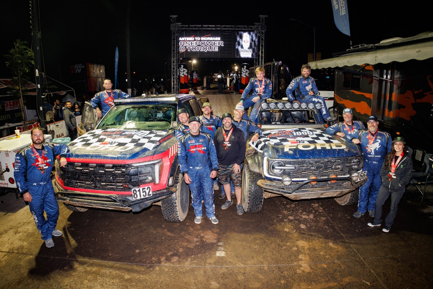 福特性能车团队(Ford Performance)的两台战车Bronco Raptor和F-150 Raptor顺利征服了Baja 1000这一久负盛名的沙漠耐力赛,也成功地进一步奠定了其在SCORE赛车组织原厂车组别的影响力和领导力——比如,SCORE特地推出了双卡车竞技项目庆贺该组织50周年金禧庆典。值得一提的是,此次也是福特性能车团队继2022年Ranger Raptor加冕中型卡车组冠军以来的再次蝉联第一。今年,Baja 1000设置长达近1200英里长的艰巨赛道:从拉巴斯一路向北到恩森那达,纵贯整个墨西哥巴哈半岛,在该赛事历史上尚属首次。