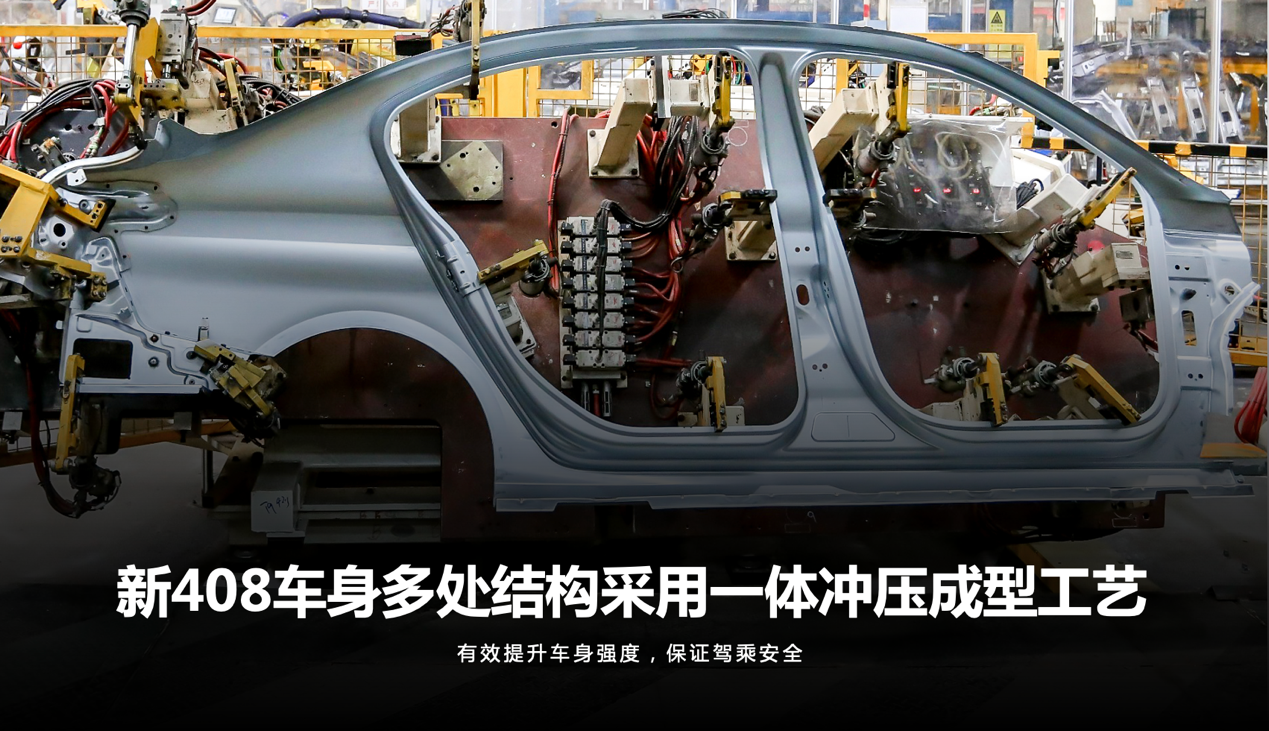 立柱、中立柱、车门防撞梁等关键受力部位大量采用至高1600MPa超高强热冲压成型钢板,高强度钢占比均超过70% ,部分车型在80%以上。此外,新408车身多处结构还采用一体冲压成型工艺,有效提升车身强度,保证驾乘安全。