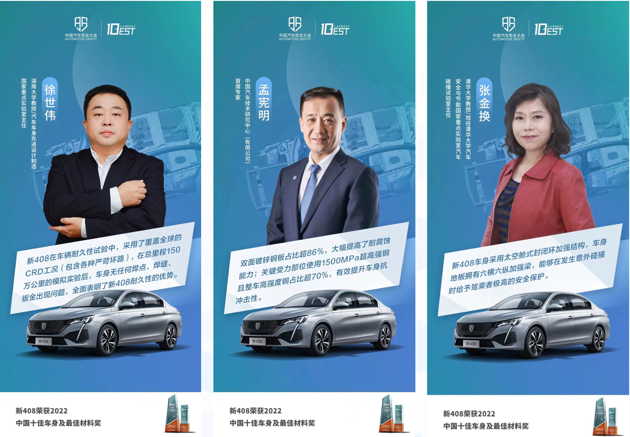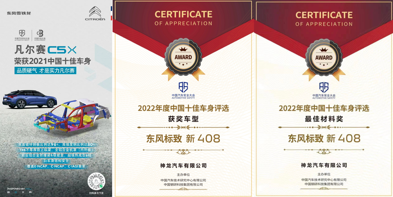 凭借着严苛的安全标准、六横六纵的车身结构、良心的车身材料、行业领先的车身工艺,东风雪铁龙、东风标致的产品多次荣获业内相关领域的大奖,如凡尔赛C5 X和新408先后荣获“2021中国十佳车身”、“2022中国十佳车身”与“最佳材料”大奖,并赢得了很多行业专家和权威人士的赞誉。
