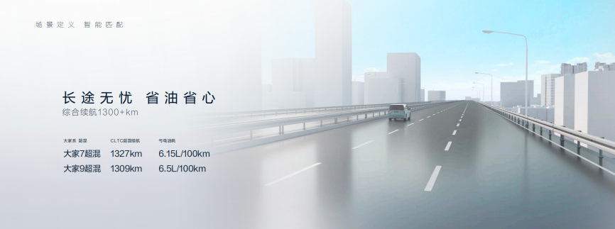 ACIS智慧全场景超混技术还聚焦于续航里程的优化与能耗的经济性,旨在实现高效化的“超能跑”,让用户随心所欲地前往远方的梦想之地。在油电混合模式下,大家9超混CLTC综合续航达1309km,WLTC馈电油耗低至6.5L/100km;大家7超混CLTC综合续航则高达1327km,WLTC馈电油耗仅6.15L/100km,两款车均显著超越同级车型。