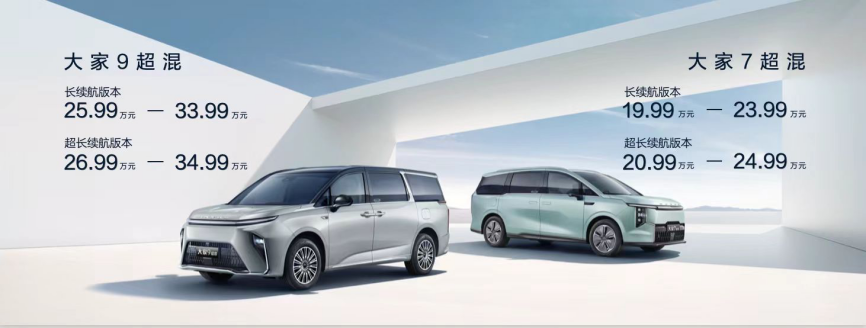 价格方面,大家9超混长续航版本预订价25.99万元-33.99万元,超长续航版本则为26.99万元-34.99万元;大家7超混长续航版本预订价19.99万元-23.99万元,超长续航版本20.99万元-24.99万元;用户仅需支付99元或77元的“意向预订金”,即可享受价值万元的续航升级权益。