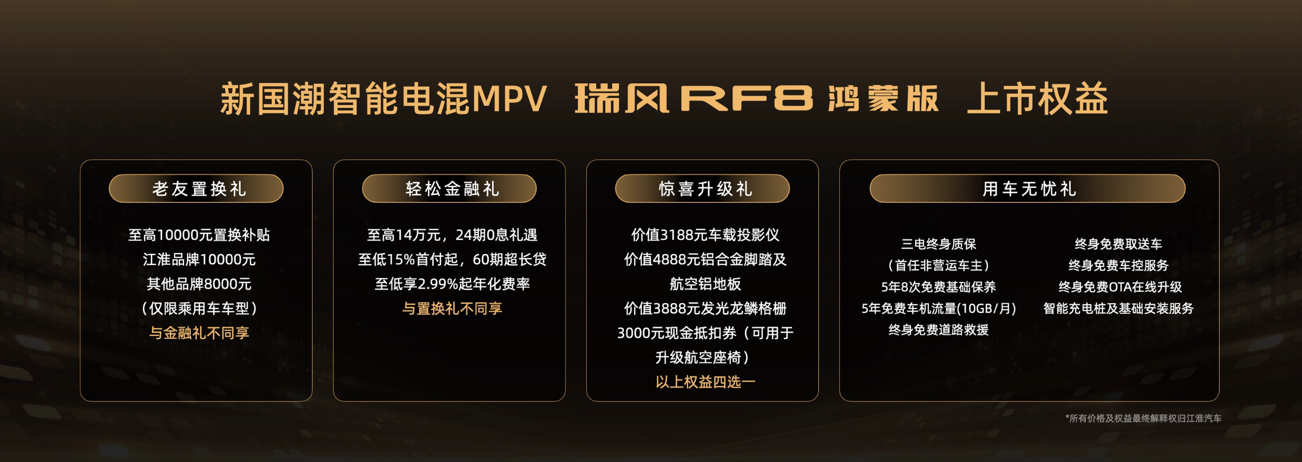 配置全面领先,一步到位标配,诚意满怀的瑞风RF8鸿蒙版提供了四重惊喜权益,包括1万元老友置换礼、多金融方案的轻松金融礼、超值选装套件的惊喜升级礼以及三电终身质保、免费充电桩及基础安装等8项超值权益的用车无忧礼。无论在购车福利、售后服务,还是在金融政策上,瑞风RF8鸿蒙版都为用户提供实实在在的价值,用诚意回馈每一位用户的信任与支持。