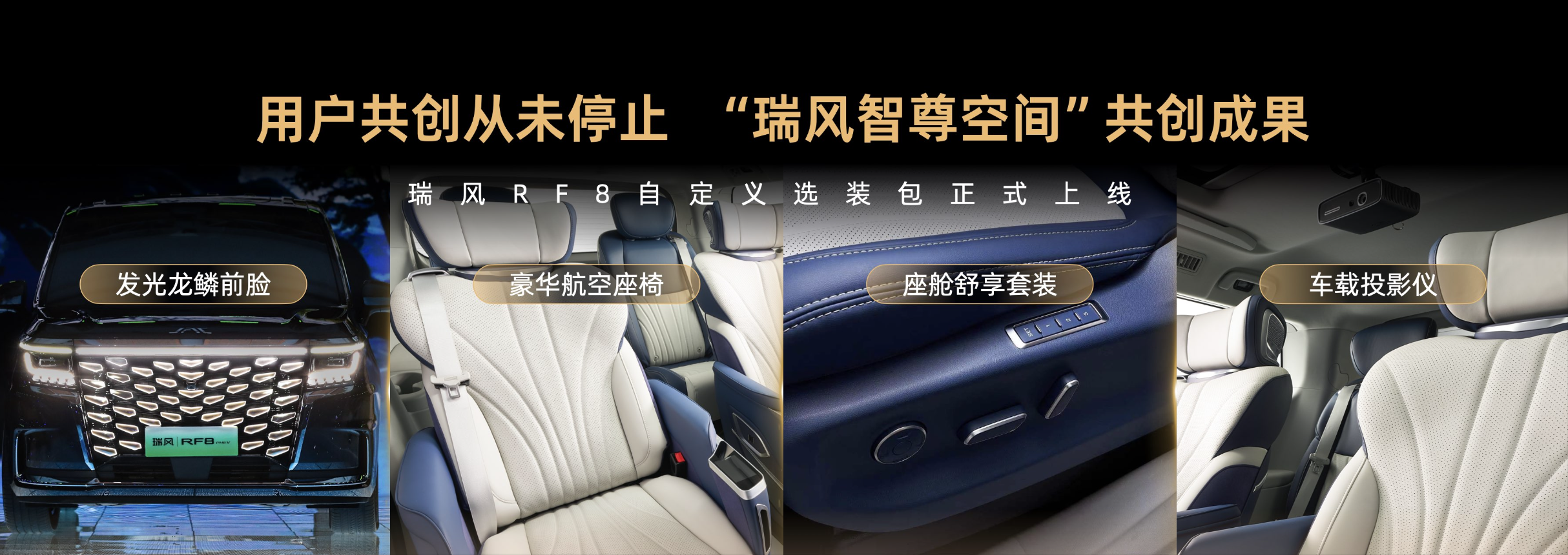 用户共创不止步,江淮瑞风携手用户再度共创,瑞风RF8为满足用户个性化需求而上线多种自定义选装包,包括发光龙鳞前脸、座舱舒享套装、车载投影仪等,已经正式上架选装,用户可以通过江淮瑞风APP自由选择,打造符合自己个性的“新国潮智能电混MPV”。