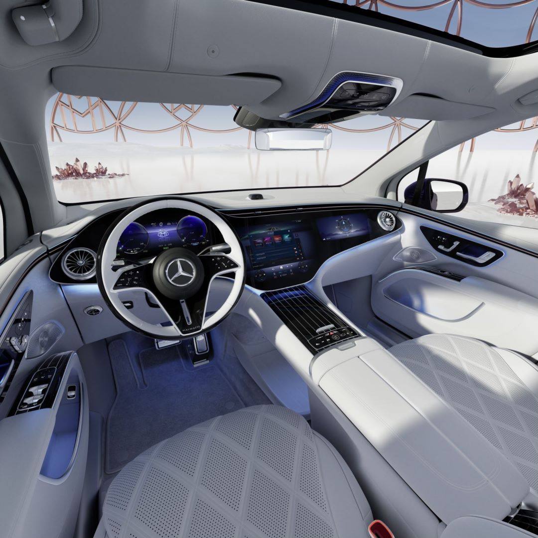 后排配备两块11.6英寸显示屏和MBUX后排平板电脑,以及折叠桌、冷藏箱、镀银香槟杯等配置,再结合个性化照明、专属No.12檀香秘境香氛、Burmester® 4D环绕立体声音响系统与杜比全景声®共同营造的多感官沉浸式体验,打造出“车轮上的殿堂”般尊享。