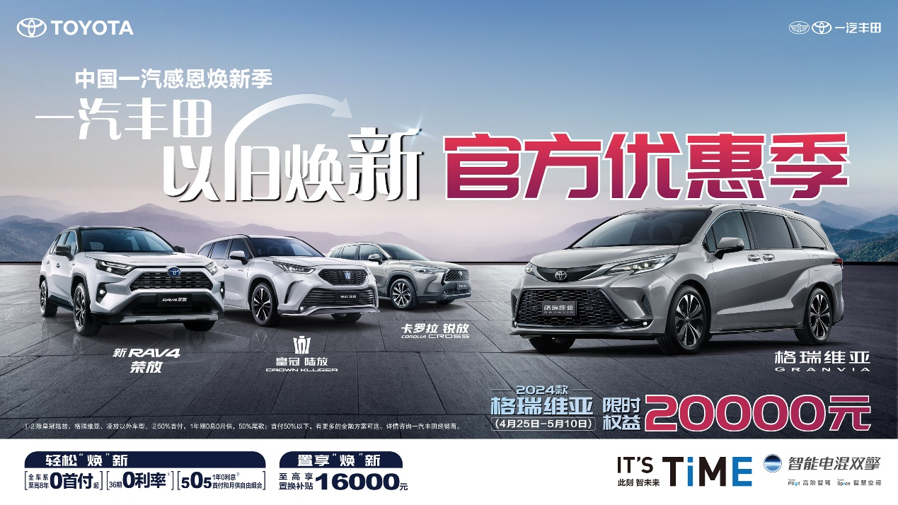 一汽丰田销量成绩的不断增长,与其始终坚守“用户中心主义”及紧跟国家政策,敏锐把握市场风向息息相关。4月初,国家发出了汽车行业“以旧换新”的政策号召,作为央企合资企业,一汽丰田迅速以“20亿钜惠”为基础,推出了金融贴息叠加以旧换新的销售政策。20亿钜惠活动还在持续,4月25日-5月10日,一汽丰田又开启了“以旧焕新官方优惠季”活动,在原有优惠基础上加码增新,2024款格瑞维亚尊享20000元限时权益,一汽丰田全车系可享至高8年0首付起、36期0利率、505 弹性金融方案等多重金融政策,及至高16000元的置换补贴,多重权益和福利诚意十足,让每一位心仪一汽丰田产品的用户都能离美好汽车生活更近一步。