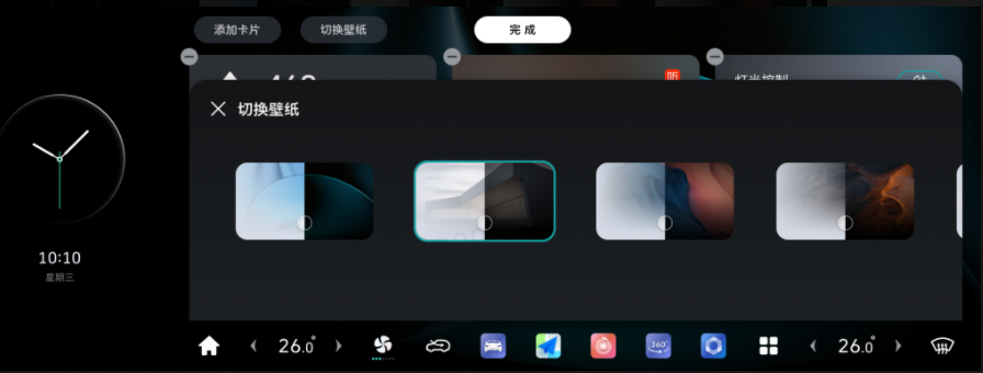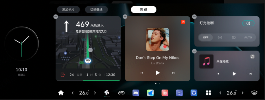 车机主交互界面经过全面优化,带来更丝滑的操作体验:屏幕显示升级为卡片式桌面,用户不仅可以根据个人喜好更换全新升级的主题壁纸,还能通过DOCK功能自定义主界面的图标显示。在白天或光线强烈的环境使用车机时,新增的白天模式,可以带来更加舒适的视觉体验;状态栏新增蓝牙以及Wi-Fi浮窗,也大大提升了操作的直观性和便捷性。