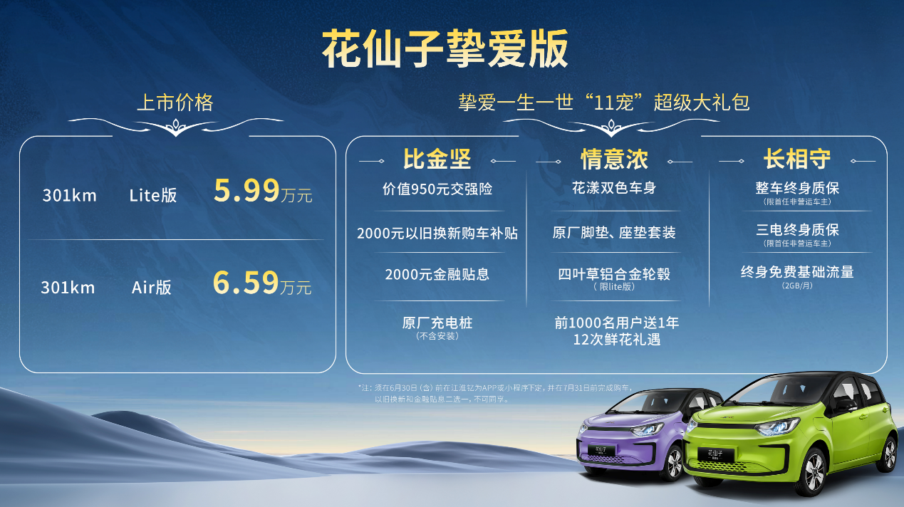 挚爱,为你而来!6月10日晚,江淮钇为花仙子挚爱版璀璨上市,新车续航301km,同级唯一五门五座布局,共推出Air版和Lite版2款配置,官方指导价6.59万元与5.99万。花仙子挚爱版此次还带来了超级宠粉权益,6月30日前在江淮钇为APP或小程序下定,可享“11宠”挚爱大礼包,即买即用,畅行无忧。在诸多车企纷纷卷技术、卷价格的时代,花仙子挚爱版更是把“福利卷上天”!