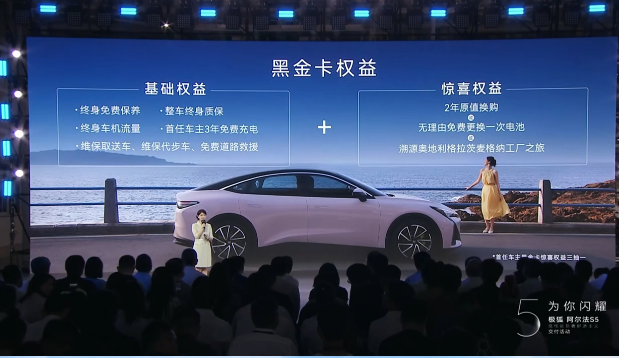 而在交付仪式上,这层紧密合体又再升级。为体现对用户的关怀,三位“大家长”带来了价值喜人的黑金卡权益,包括终身免费保养、终身车机流量、首任车主3年免费充电、维保取送车、维保代步车、免费道路救援等钜惠权益,让用户代表们大呼惊喜。
