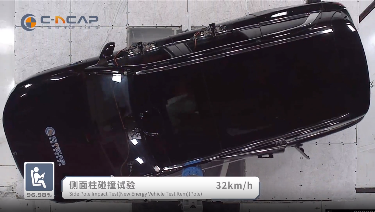 第二项就是侧面柱碰撞测试,问界M9座椅侧气囊和头部气帘均及时顺利展开,足够多的保护区域避免了乘员头部与车窗玻璃、内饰件等发生直接接触,同时,天幕玻璃也没有任何碎裂。与此同时,问界M9碰撞之后双闪及时开启,E-CALL救援功能自动拨出并做出响应,且车门解锁,门把手正常弹开,两侧车门均能正常打开,碰撞后高压迅速下电,电解液无泄漏,电池包未出现起火、爆炸及冒烟现象。