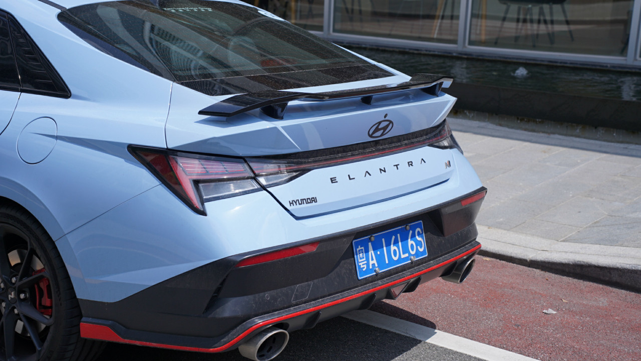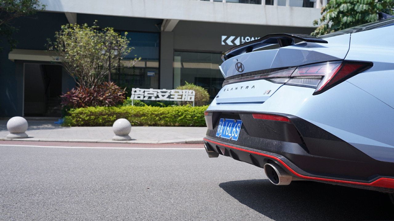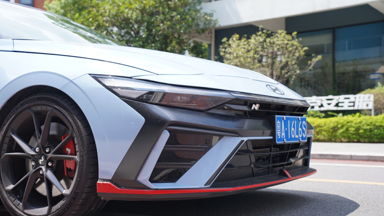 我试驾的这台车,叫现代伊兰特N,是现代N这个高性能车家族下的代表车款。这台车上市于2023年11月,是一台纯燃油车,账面动力参数其实并不算很出众,一台2.0T发动机,最大马力276匹,最大扭矩392牛·米,搭配一台8速双离合变速箱。这是一台前驱车,没有四驱版本,前麦弗逊后多连杆悬架,245/35 R19的轮胎,有前桥LSD,零百加速5.3秒。